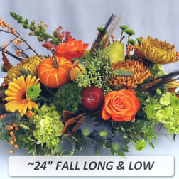 Price: $185.00$185 - $295 Fall Flowers & Colors - Designer's Choice ~24" Long & Low Arrangement